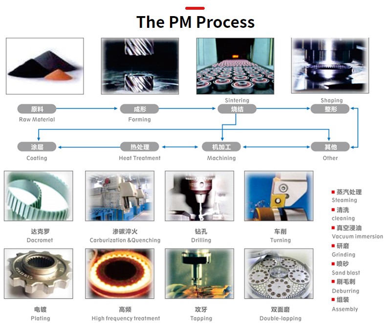 Des profils de dents précis et des tolérances de pas strictes sont garantis par une fabrication de moules de précision, permettant un engagement en douceur de la chaîne et une réduction du bruit et de l'usure. La conception offre de la flexibilité en permettant le moulage en une seule étape d'éléments complexes tels que les moyeux de roue, les brides, les nervures de renforcement et divers types de trous d'arbre, ce qui réduit les coûts de traitement et d'assemblage ultérieurs. Par rapport aux composants traditionnels moulés ou forgés, les pignons de métallurgie des poudres offrent une réduction de poids à résistance équivalente, contribuant ainsi à une inertie de rotation plus faible. De plus, le processus de métallurgie des poudres garantit une excellente cohérence, offrant une uniformité dimensionnelle et des performances élevées sur tous les pignons produits en série. Largement appliqué dans : composants de moteur automobile. Boîtes de vitesses de transmission automobile et ensembles de boîtes de transfert.